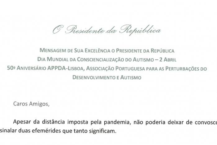O dia 2 de abril, Dia Mundial da Consciencialização do Autismo, como tal estabelecido pela Assembleia Geral da Organização das Nações Unidas, é o dia em que, reconhecendo o caminho já percorrido, se apela a toda a comunidade para que venha tomar conhecimento do que são as PEA e do que significa viver e conviver com PEA, designadamente, através dos documentos essenciais que balizam esse caminho, agora e para o futuro, entre os quais aqueles a que a FPDA-Federação Portuguesa de Autismo se refere na mensagem difundida nesta ocasião.