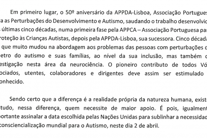 Na sua qualidade de membro fundador, a APPDA-Lisboa celebra esta data com a FPDA e todas as entidades federadas, suas congéneres. Com elas, vem também partilhar a celebração de outra data recente, a de 16 de março, em que se perfizeram 50 anos sobre a constituição em Portugal da primeira associação com o objetivo de prestar apoio a pessoas com autismo e suas famílias, a Associação Portuguesa para Proteção às Crianças Autistas, o primeiro passo no nosso caminho comum.